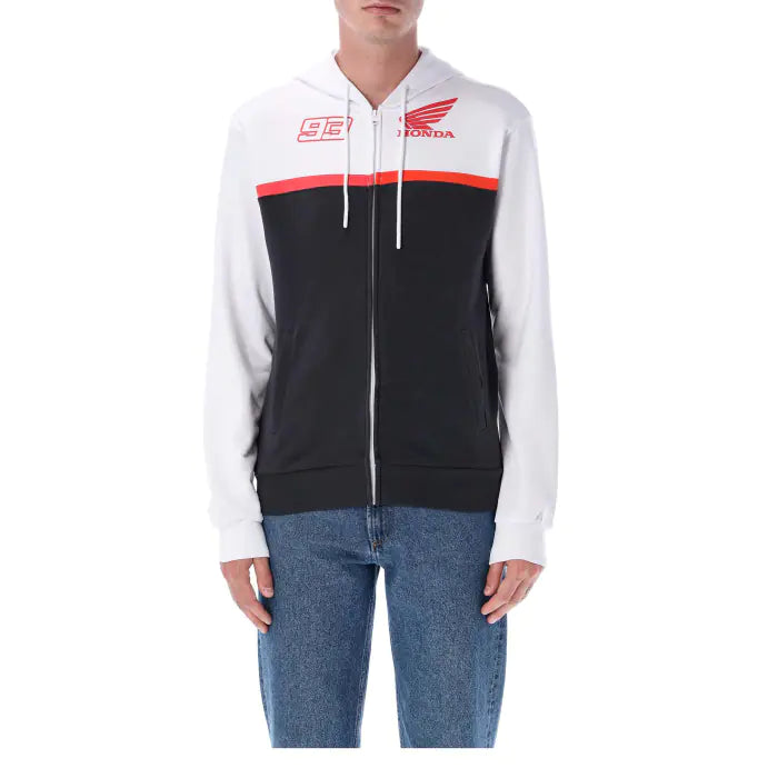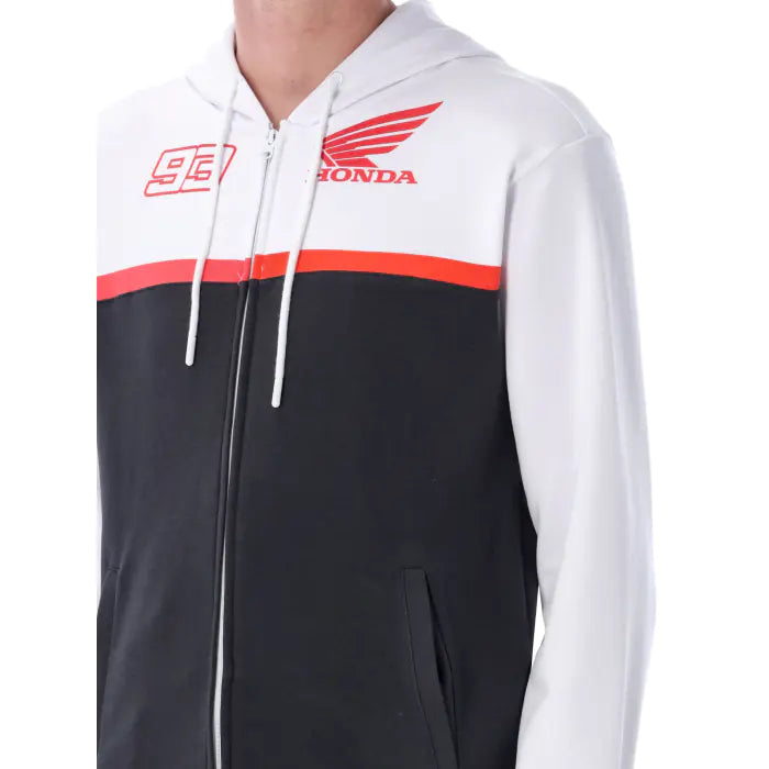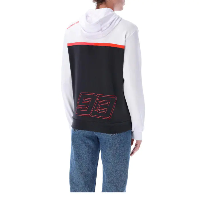 Sweat Hoodie Marc Marquez MM93 Honda oficial da coleção Dual Marc Marquez Honda.  Base preta com inserção vermelha, parte superior, capuz e mangas brancas. Logotipo da Honda e número 93 impressos...